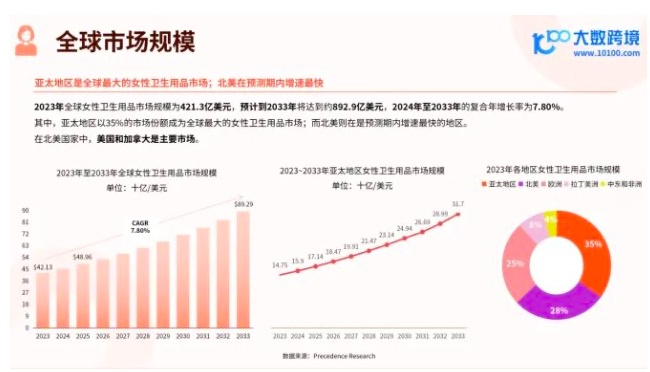 2023年以来,女性护理用品生产线的平均利用率已经远超婴童护理用品,从增长前景来看,女性护理用品市场是千亿赛道。公开数据显示,预计到2033年全球女性卫生用品市场规模达到约892.9亿美元,2024-2033年复合年增长率约为7.8%。亚太市场份额最大,北美增速最快。细分品类方面,2024全球卫生巾市场规模约为280亿美元,占据主导地位。