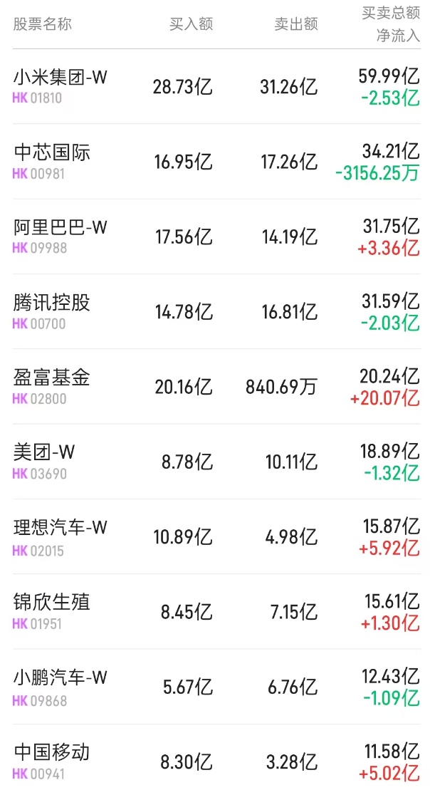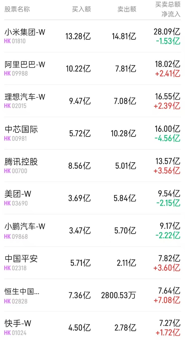 此外,中国平安(02318)、腾讯(02318)分别获净买入3.6亿、1.52亿港元。而中芯国际(00981)、小鹏汽车-W(09868)分别遭净卖出4.87亿、3.31亿港元。