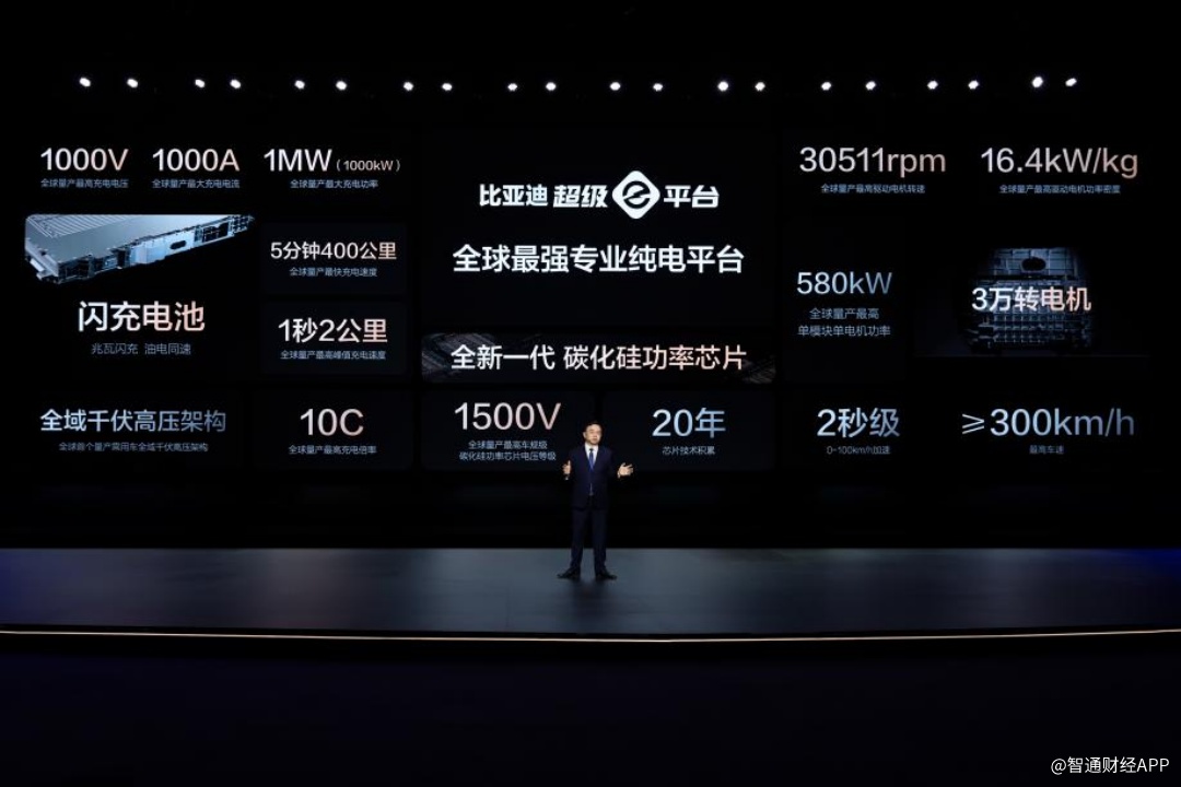 2025年3月17日,比亚迪召开超级e平台技术发布暨汉L、唐L预售发布会,发布划时代超级e平台,推出闪充电池、3万转电机和全新一代车规级碳化硅功率芯片,核心三电全维升级,刷新多项全球之最,电动化布局不断提速。在充电速度上,实现充电功率1兆瓦(1000kW),实现全球量产最高峰值充电速度1秒2公里,达到全球量产最快充电速度——闪充5分钟,畅行400公里;在性能上,达到单模块单电机功率580kW,最高车速超300km/h,定义全球最强专业纯电平台,首发搭载于划时代旗舰汉L、唐L,即日起正式开启预售,引领电动车下一个时代。