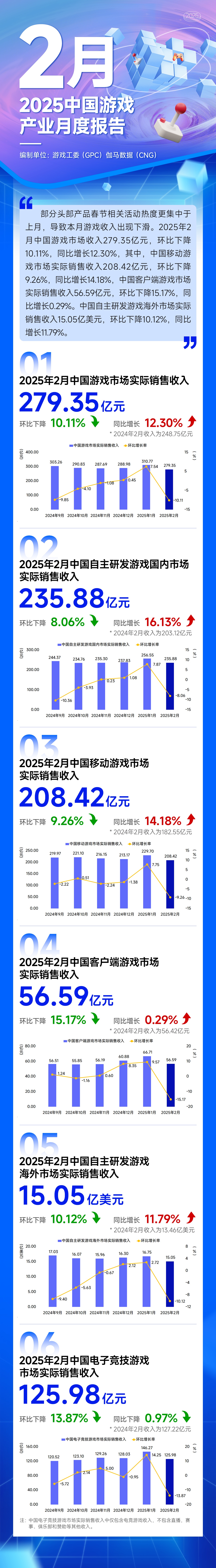 智通财经APP获悉,中国音数协游戏工委发布《2025年2月中国游戏产业月度报告》。2025年2月中国游戏市场收入279.35亿元,环比下降10.11%,同比增长12.30%,其中,中国移动游戏市场实际销售收入208.42亿元,环比下降9.26%,同比增长14.18%,中国客户端游戏市场实际销售收入56.59亿元,环比下降15.17%,同比增长0.29%。中国自主研发游戏海外市场实际销售收入15.05亿美元,环比下降10.12%,同比增长11.79%。