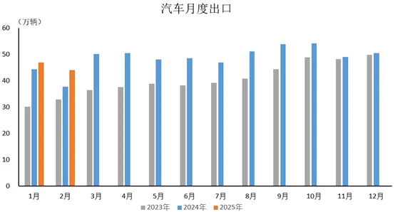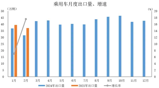 2025年2月,乘用车出口37.1万辆,环比下降6.3%,同比增长17.6%。2025年1-2月,乘用车出口76.6万辆,同比增长11.7%。
