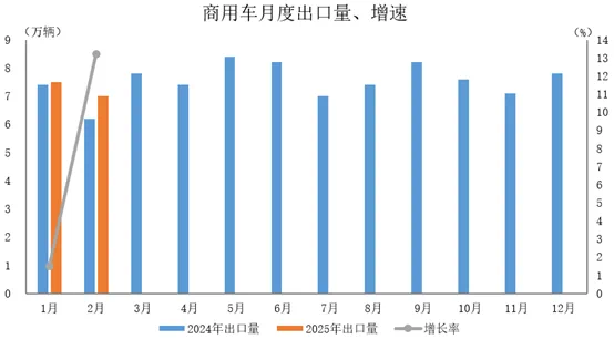 2025年2月,商用车出口7万辆,环比下降6%,同比增长13.2%。2025年1-2月,商用车出口14.5万辆,同比增长6.9%。