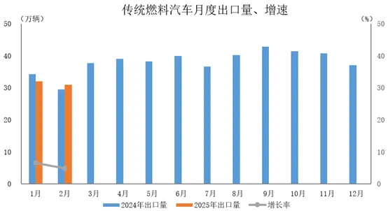 2025年2月,传统燃料汽车出口31万辆,环比下降3.2%,同比增长4.9%。2025年1-2月,传统燃料汽车出口62.9万辆,同比下降1.5%。