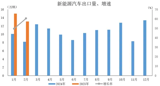 2025年2月,新能源汽车出口13.1万辆,环比下降12.6%,同比增长60.5%。2025年1-2月,新能源汽车出口28.2万辆,同比增长54.5%。