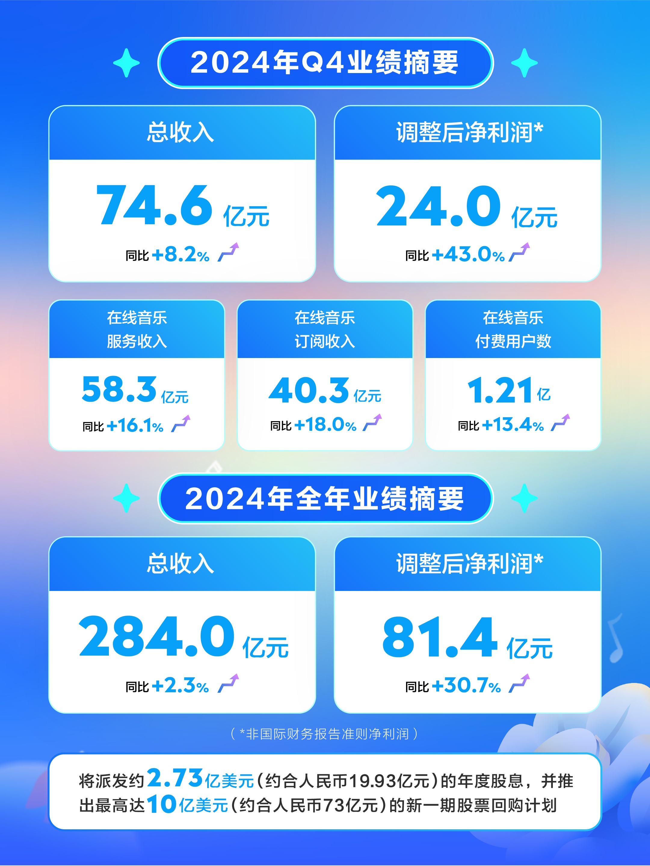 而股票回购及派息计划的公布则进一步凸显了腾讯音乐的投资价值。在此份财报中,腾讯音乐宣布派发约2.73亿美元的年度现金股息,并推出新一期股票回购计划,可在自2025年3月起的24个月内回购最高达10亿美元的A类普通股。