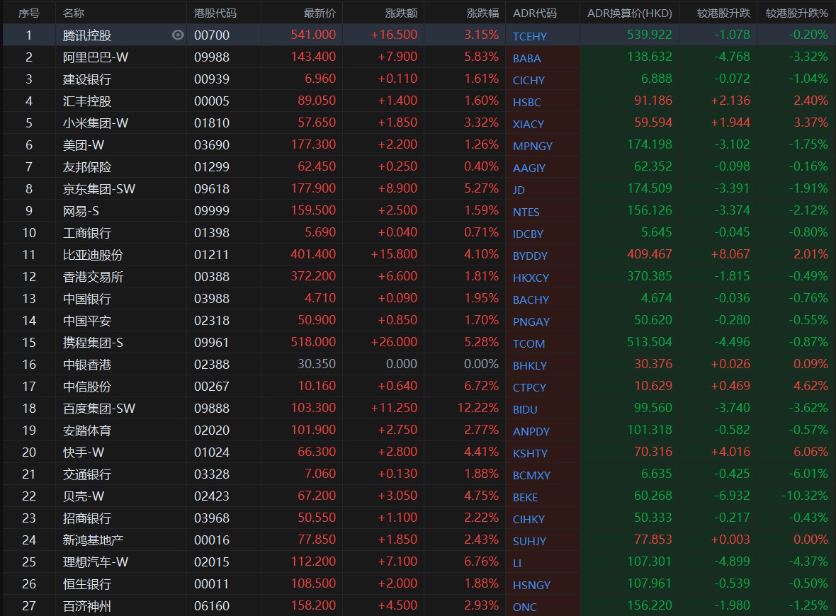 大型蓝筹股涨跌不一,汇丰控股收报91.186港元,较香港收涨2.4%;腾讯控股收报539.922港元,较香港收市跌0.2%。