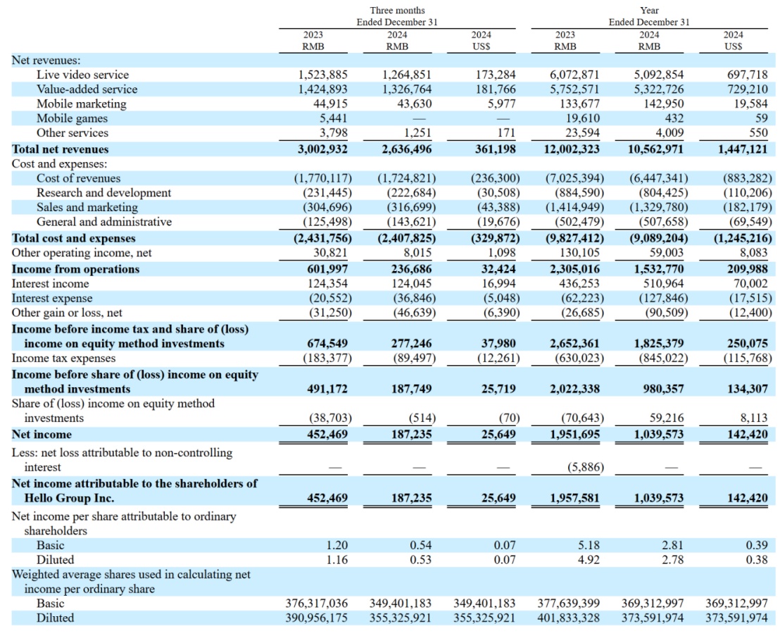 从24Q4季度的分部业绩及运营数据来看,公司当期来自直播的收入为12.65亿元(约1.73亿美元),同比下降17%。财报中,公司表示该分部业绩下降主要归因于其主动进行的运营调整,不再强调陌陌应用中的大型比赛活动,以及当前消费者情绪低迷。