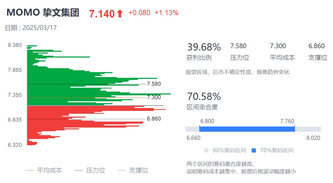 当前整体筹码获利比例为39.68%,结合盘面不难看到,3月12日的大分歧表现已经洗出了部分短线筹码,底部获利筹码主要来自于3月12日的进场抄底资金。但近3个交易日,场内一致转分歧迹象明显,但整体成交量还未上400万股,价值投资的属性也使得场内更倾向做T而非抛售(筹码平均成本已从7.34美元降至7.30美元)。