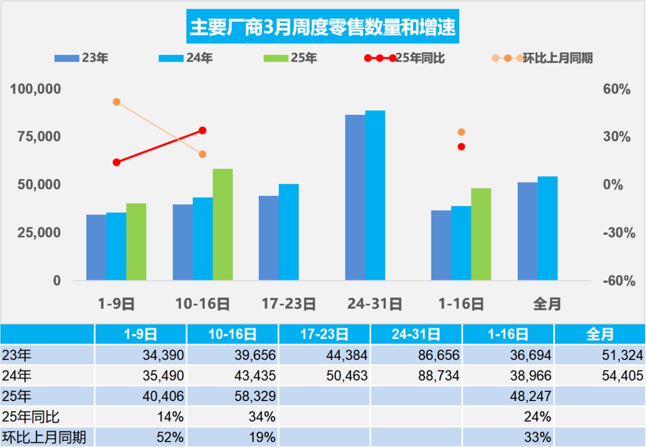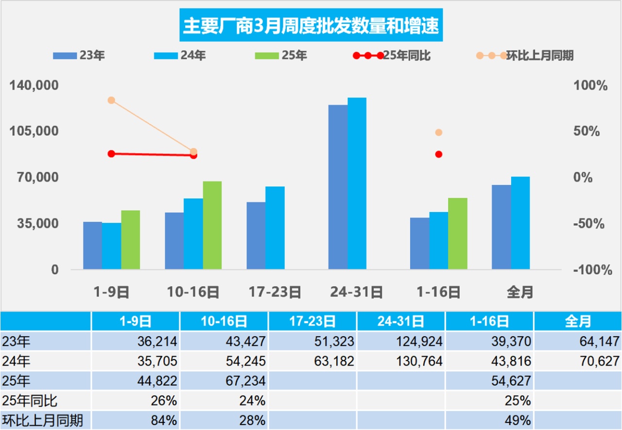 3月1-16日,全国乘用车厂商批发87.4万辆,同比去年3月同期增长25%,较上月同期增长49%;今年以来累计批发473.9万辆,同比增长15%。