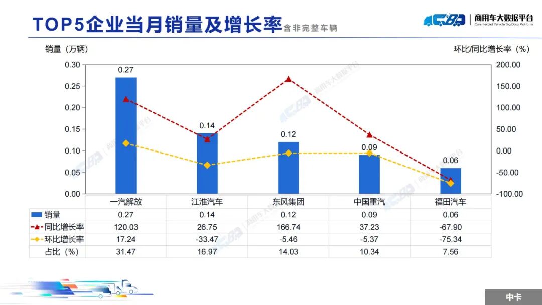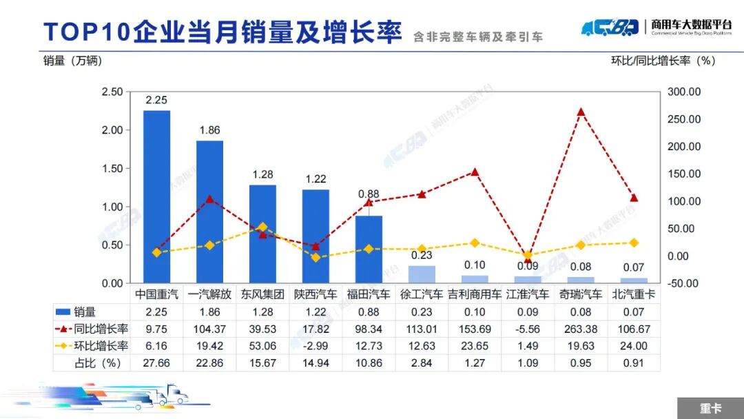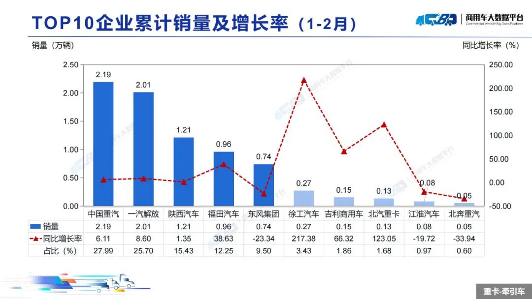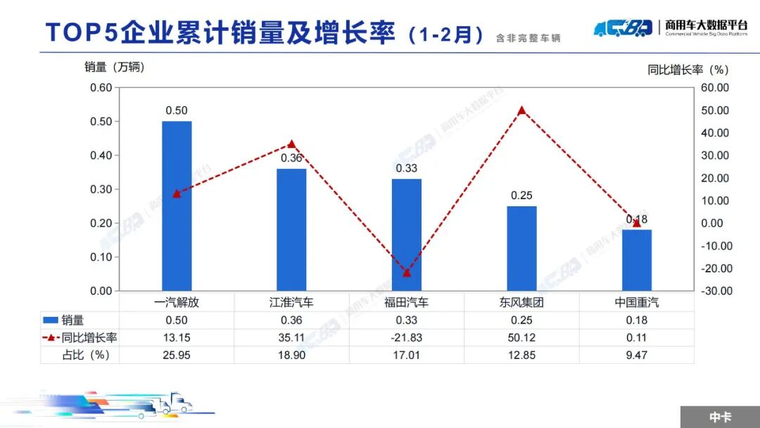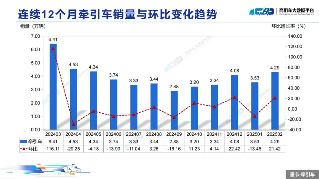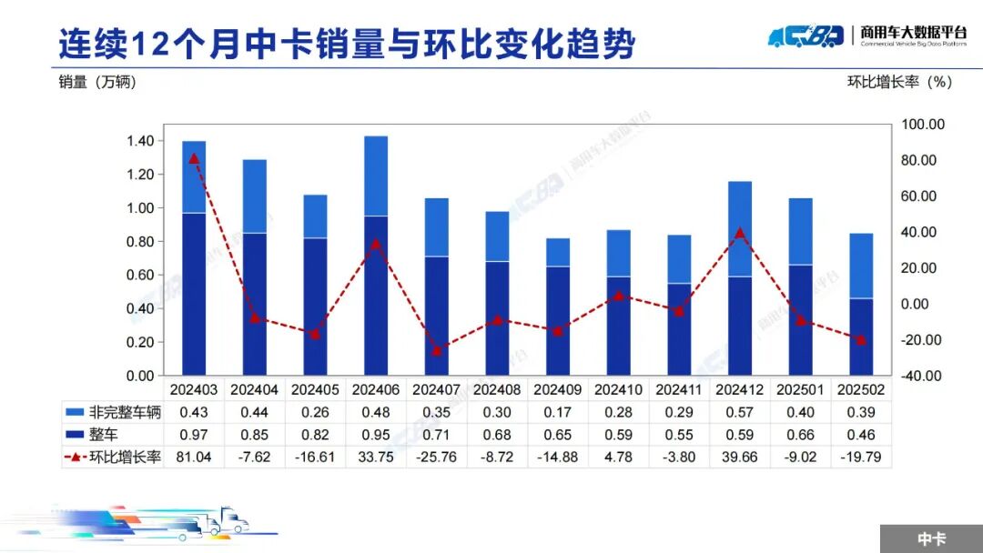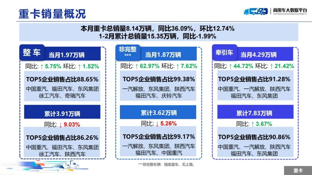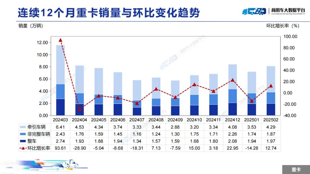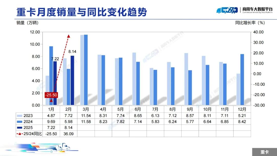 智通财经APP获悉,近日,中国汽车流通协会商用车专业委员会发布2025年2月中重型卡车销量月度形势分析报告。报告称,2025年2月全国重型卡车销量(批发)为8.14万辆,同比上升36.09%,环比下降上涨12.74%;中型卡车销量(批发)为0.85万辆,同比上涨10.54%,环比下降19.79%。1-2月,全国重型卡车销量(批发)为15.35万辆,同比下降1.99%;中型卡车销量(批发)为1.91万辆,同比上涨4.60%。