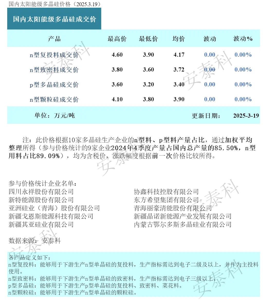 智通财经APP获悉,3月19日,硅业分会发文称,本周多晶硅价格维持稳定。n型复投料成交价格区间为3.90-4.60万元/吨,成交均价为4.17万元/吨,n型颗粒硅成交价格区间为3.80-4.10万元/吨,成交均价为3.90万元/吨,p型多晶硅成交价格区间为3.20-3.60万元/吨,成交均价为3.40万元/吨。
