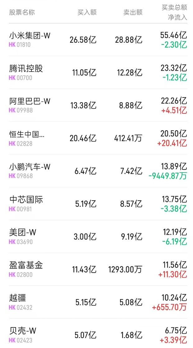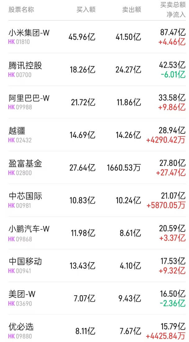 此外,小米集团-W(01810)、优必选(09880)分别获净买入2.16亿、4425万港元。而中芯国际(00981)遭净卖出2.79亿港元。