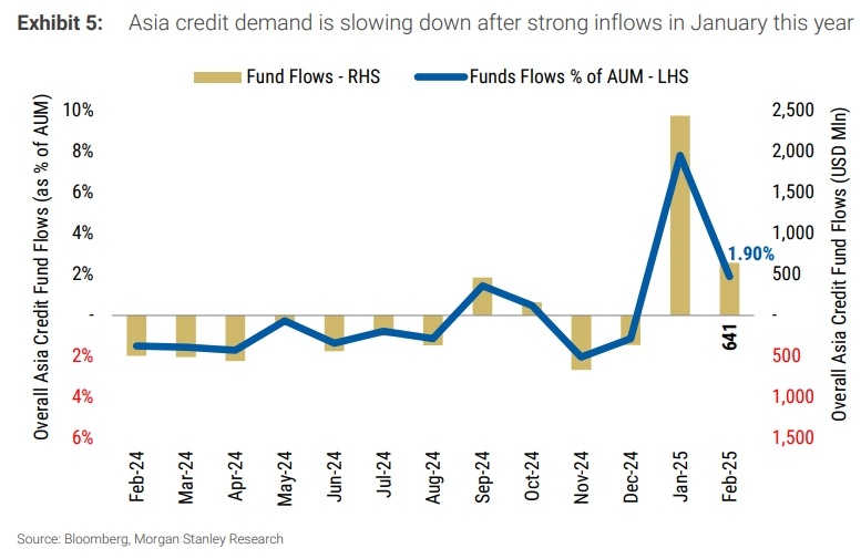 然而,2月份,亚洲信用债基金的流入速度已明显放缓,仅为6.41亿美元。