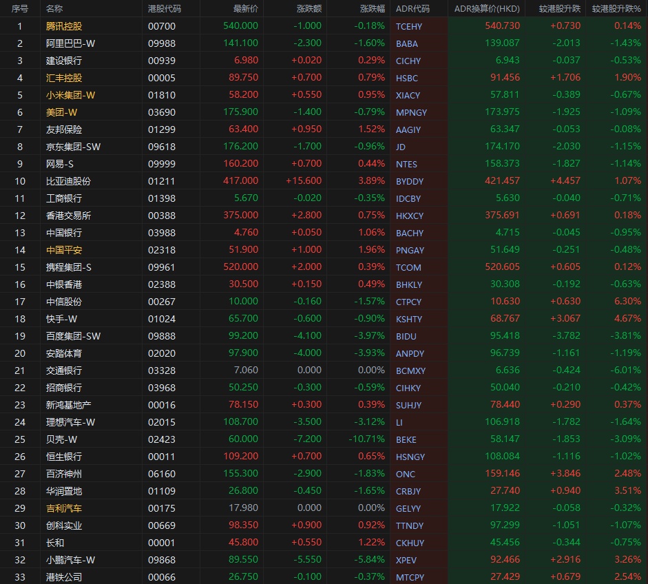 大型蓝筹股涨跌不一,汇丰控股收报91.456港元,较香港收涨1.9%;腾讯控股收报540.73港元,较香港收市涨0.14%。