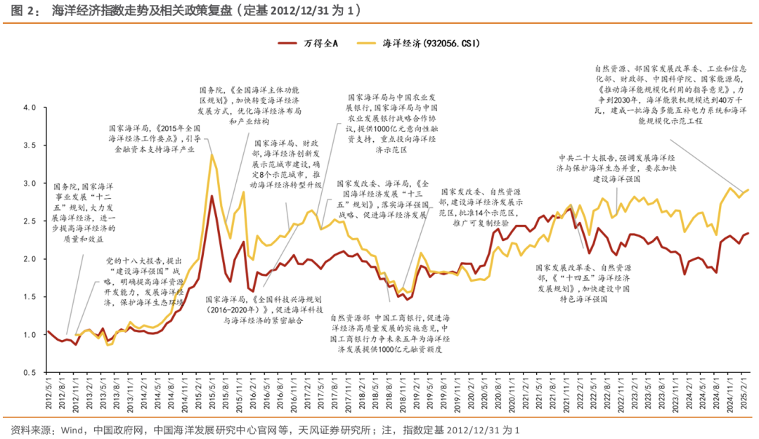 复盘我国海洋经济的发展,自 2021 年提出“海洋强国”战略目标以来,海洋经济在政策驱动下不断深化发展,2021年后随着疫情缓和及“双碳”政策发力,海上风电、海水淡化等新兴产业崛起,海洋经济向绿色化、高端化转型颇具成效。
