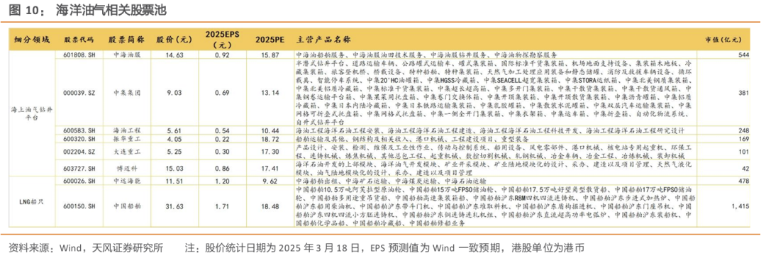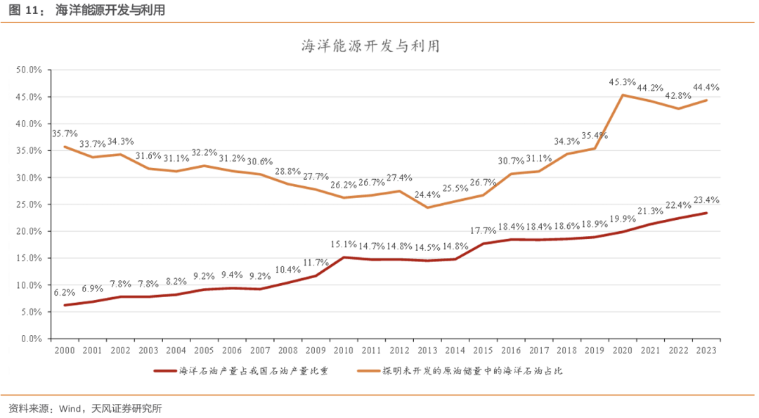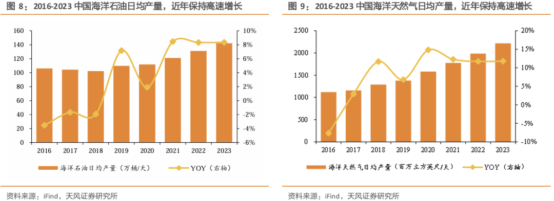海洋油气装备:中国海洋石油储量增长处于高峰阶段前期,海洋天然气储量增长仍处于早期阶段,未来海上油气储量产量增长潜力仍然很大。建议关注海上油气钻井平台、LNG船只等细分领域。