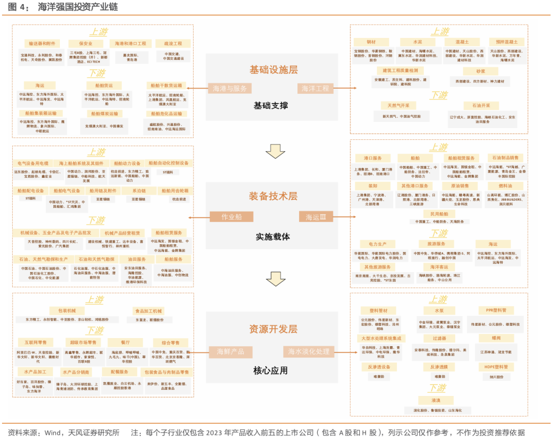2)海洋经济产业链投资:海洋经济产业链较长,这也是海洋经济产出体量大的原因之一。具体来看,海洋经济产业链可以分为基础设施层、装备技术层、资源开发层三个层级。基础设备层包括海港与服务、海洋基础设施,是海洋经济发展的基础支撑;装备技术层包括作业船和海运,装备与制造环节是深海科技的实施载体,或将最先受益于深海科技建设;资源开发层是海洋经济与技术的核心应用环节,包括海水淡化处理、海鲜产品等环节。我们整理了与海洋经济相关的产业链各环节以及各细分领域的代表上市公司作为参考,如下: