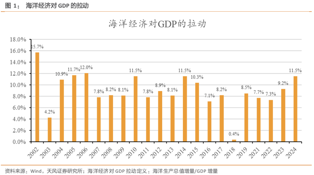 核心结论:海洋经济驱动经济提速,深海科技为其注入新质内涵。海洋经济有效拉动GDP增长,产业空间具备规模。2024年全国海洋生产总值首次突破10万亿元,对GDP的拉动作用达11.5%,已成为驱动经济增长的新引擎。政府报告在新质生产力部分首次提及“深海科技”,为海洋经济注入新内涵。2025年政府工作报告提出,“开展新技术新产品新场景大规模应用示范行动,推动商业航天、低空经济、深海科技等新兴产业安全健康发展。”我们认为,深海科技与商业航天、低空经济并列,有望获得较高速发展,尤其是在深海装备、深海探索等核心科技领域。
