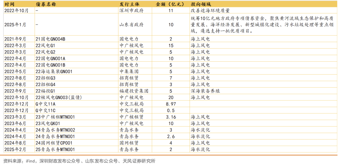1) 海洋经济专项债:在"海洋强国"战略驱动下,以蓝色债券为代表的创新型金融工具正成为推动海洋经济高质量发展的重要抓手,通过引导资本向海上风电、海水淡化等绿色产业聚集,形成政策支持与市场机制的协同发力,随着2025年政策红利释放有望加速海洋经济专项债发行节奏。