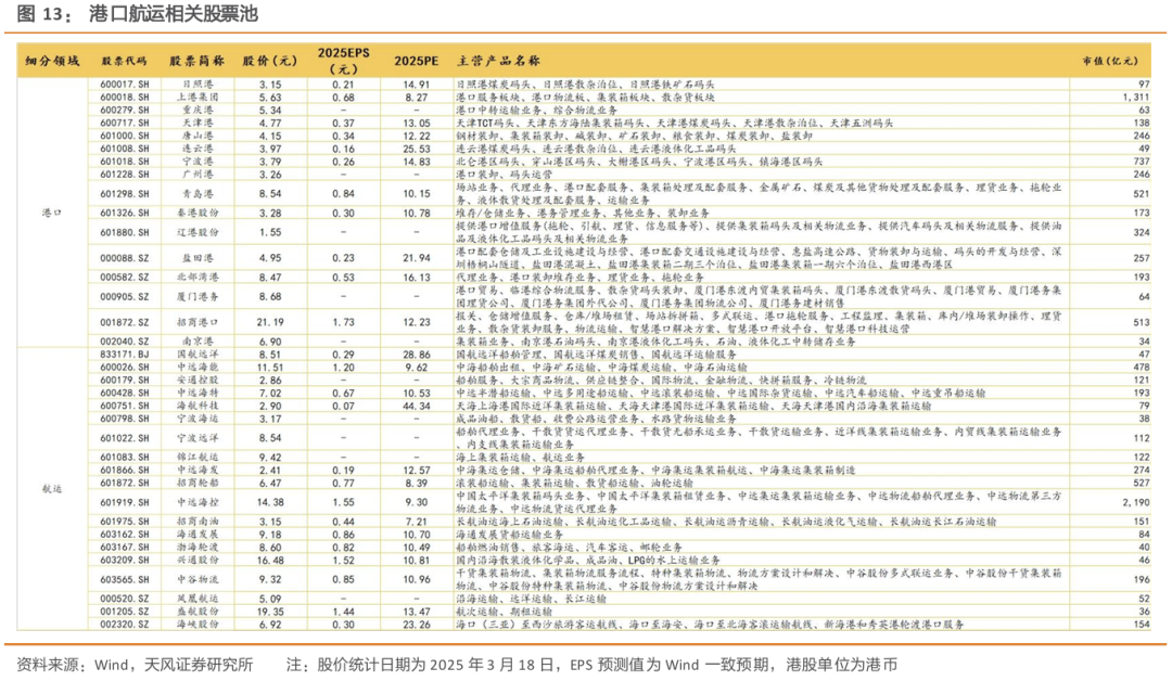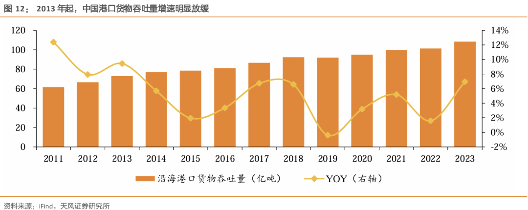 港口航运:自2013年起,中国港口货物吞吐量增速明显放缓,行业从快速成长期步入成熟期,海洋经济强国有望成为港口航运新的增长点。在全球经济增速位于低位的背景下,集装箱吞吐量或趋于稳定。港口的吞吐量和航运运输增长有望得到发展海洋经济强国的支撑。建议关注港口、航运等细分领域。