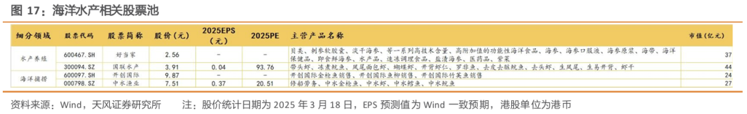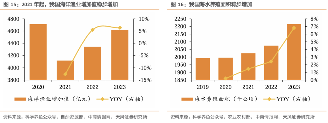 海洋水产:2023 年来,海洋渔业受到国家政府的大力支持,相关部门发布了一系列政策文件,如《2024年水产绿色健康养殖技术推广“五大行动”实施方案》《关于加快推进深远海养殖发展的意见》等。自2021年起,我国海洋渔业增加值和海水养殖面积稳步增加。根据农业农村部数据,我国已建设169个国家级海洋牧场,深远海养殖水体达5660万立方米,产量47万吨。关注海洋捕捞以及水产养殖等细分领域。