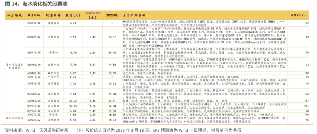 海水淡化:我国的水资源总量在全球排名第六,然而人均水资源量却仅为世界平均水平的25%。通过发展海水淡化技术,从海洋中提取淡水,已成为解决沿海地区水资源供需失衡、确保供水安全的有效策略,且在发展海洋经济强国的背景下,海水淡化将作为补充水资源的重要方式。根据自然资源部发布的《2023 年全国海水利用报告》,2023 年全国现有海水淡化工程156个,工程规模2522956吨/日,比2022年增加了165908吨/日。全国海水淡化工程分布在辽宁、天津、河北、山东、江苏、浙江、福建、广东、广西、海南10个沿海省(区)市,海水淡化自2019年起,进入高速增长时期。建议关注海水淡化设备制造材料以及海水淡化工程等细分领域。