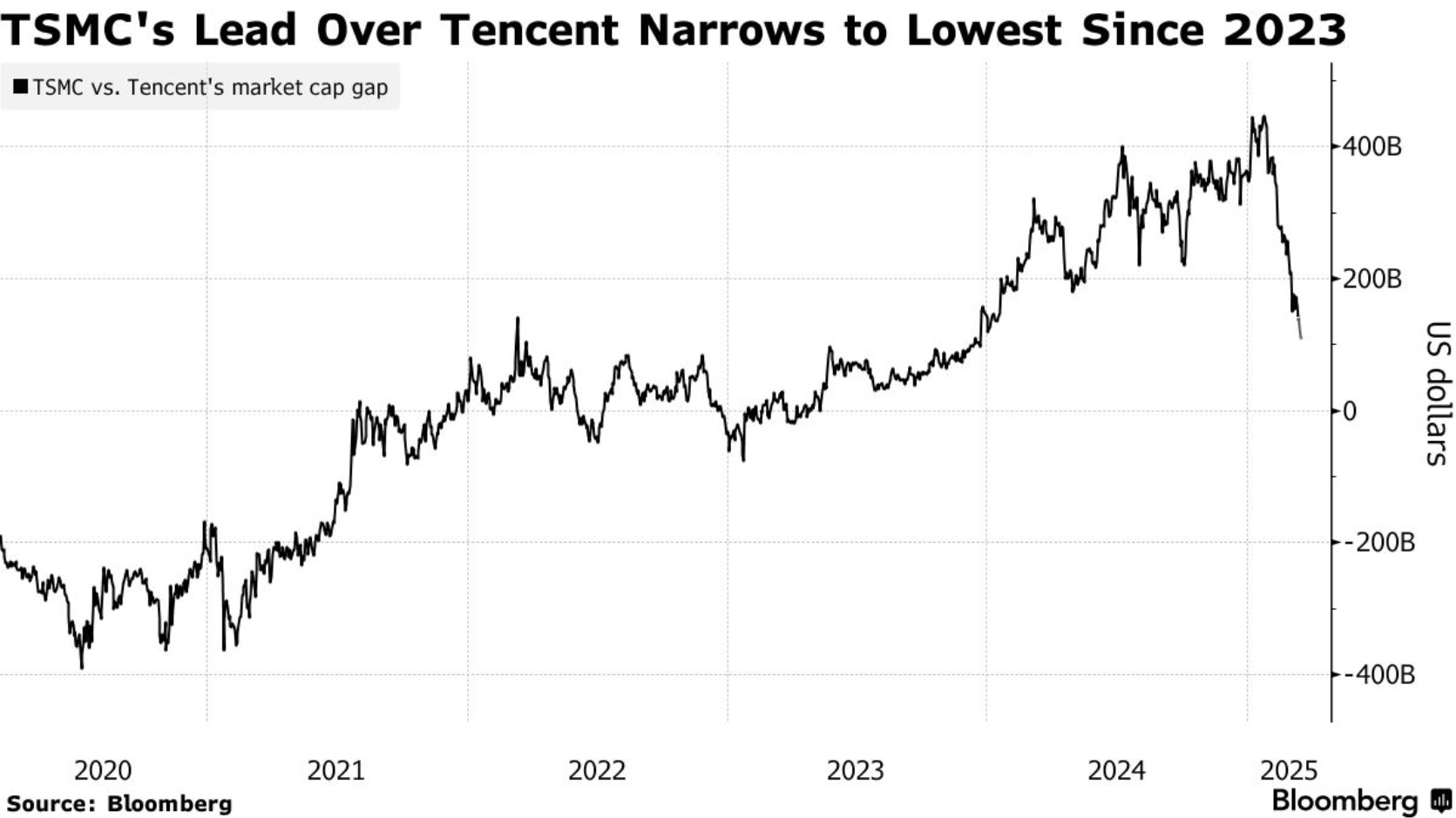 据了解,今年以来,台积电股价累计下跌11%,与英伟达等全球芯片股一同陷入调整。市场担忧半导体行业存在估值泡沫,叠加全球电子需求疲软,导致资金持续流出。反观腾讯控股,年内股价逆势上扬约30%,不仅跑赢恒生科技指数,更将与台积电的市值差距从2023年底大幅缩小。