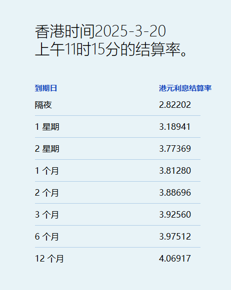 智通财经APP获悉,美国联储局议息后宣布维持利率不变,符合市场预期。会后声明表示,仍然预计今年减息两次,减幅共为 0.5%。港元拆息今日全线上升,其中,隔夜息升近11基点至 2.82202%,而与楼按相关的一个月拆息连升三天,报 3.8128%,齐创 3 月 12 日以来最高。