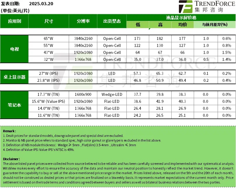 智通财经APP获悉,根据TrendForce集邦咨询旗下显示器研究中心《TrendForce 2025面板价格预测月度报告》最新调研数据,2025年3月下旬,电视面板与显示器面板价格上涨,笔电面板价格持稳。