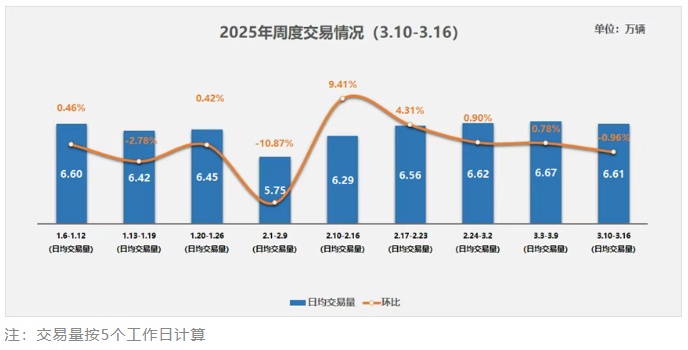 智通财经APP获悉,3月20日,中国汽车流通协会发布二手车周度快报。2025年3月10日-16日,二手车日均交易量6.61万辆,环比上周下降0.96%,较2月同期增长5%,二手车日均交易规模保持在6.6万辆水平。