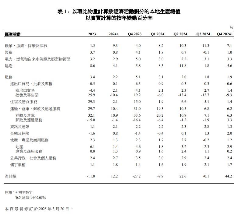 智通财经APP获悉,2025年3月20日,香港特区政府统计处发布2024年第四季及2024年全年环比物量计算按经济活动划分的本地生产总值初步数字。根据初步统计数字,整体本地生产总值在2024年第四季较上年同期实质上升2.4%,而2024年第三季的升幅为1.9%。2024年全年与2023年比较,本地生产总值实质上升2.5%。