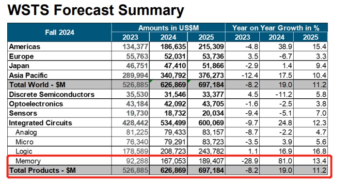 WSTS预计,2025年的半导体市场规模增长将主要由强劲的AI训练/推理算力需求所驱动的企业级存储芯片类别,以及人工智能逻辑芯片类别所大力推动,预计2025年包含CPU、GPU以及ASIC芯片的逻辑芯片类别整体市场规模有望同比增长约17%,覆盖HBM、企业级SSD等领域的存储芯片类别市场规模有望在2023年大幅增长81%的基础上同比增长超13%;同时WSTS还预计分立器件、光电子、传感器、MCU以及模拟芯片等所有其他细分芯片市场的增长率都将达到个位数增幅。