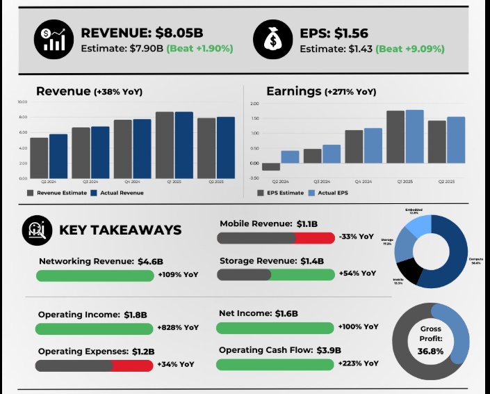 截至2月底的第二财季业绩方面,总部位于爱达荷州博伊西的美光科技表示,第二财季整体营收同比大幅增长38%至80.5亿美元,高于分析师们平均预测的79.1亿美元,其中与AI数据中心大规模建设密切相关的存储芯片业务营收实现翻三倍。剔除某些项目后,调整后(Non-GAAP) 的摊薄每股收益增长至1.56美元,远远强于上年同期的约0.42美元,超出1.43美元的分析师平均预期。