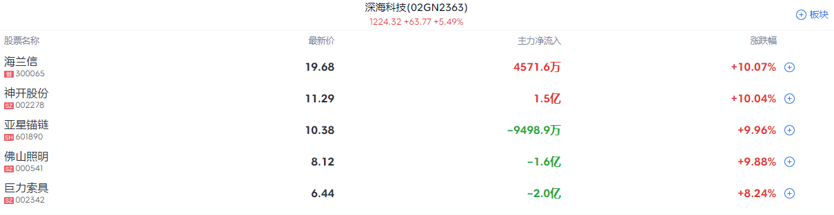 深海科技概念股反复活跃,大连重工、赛福天、开创国际涨停,邵阳液压、巨力索具、振华重工、宝塔实业等跟涨。