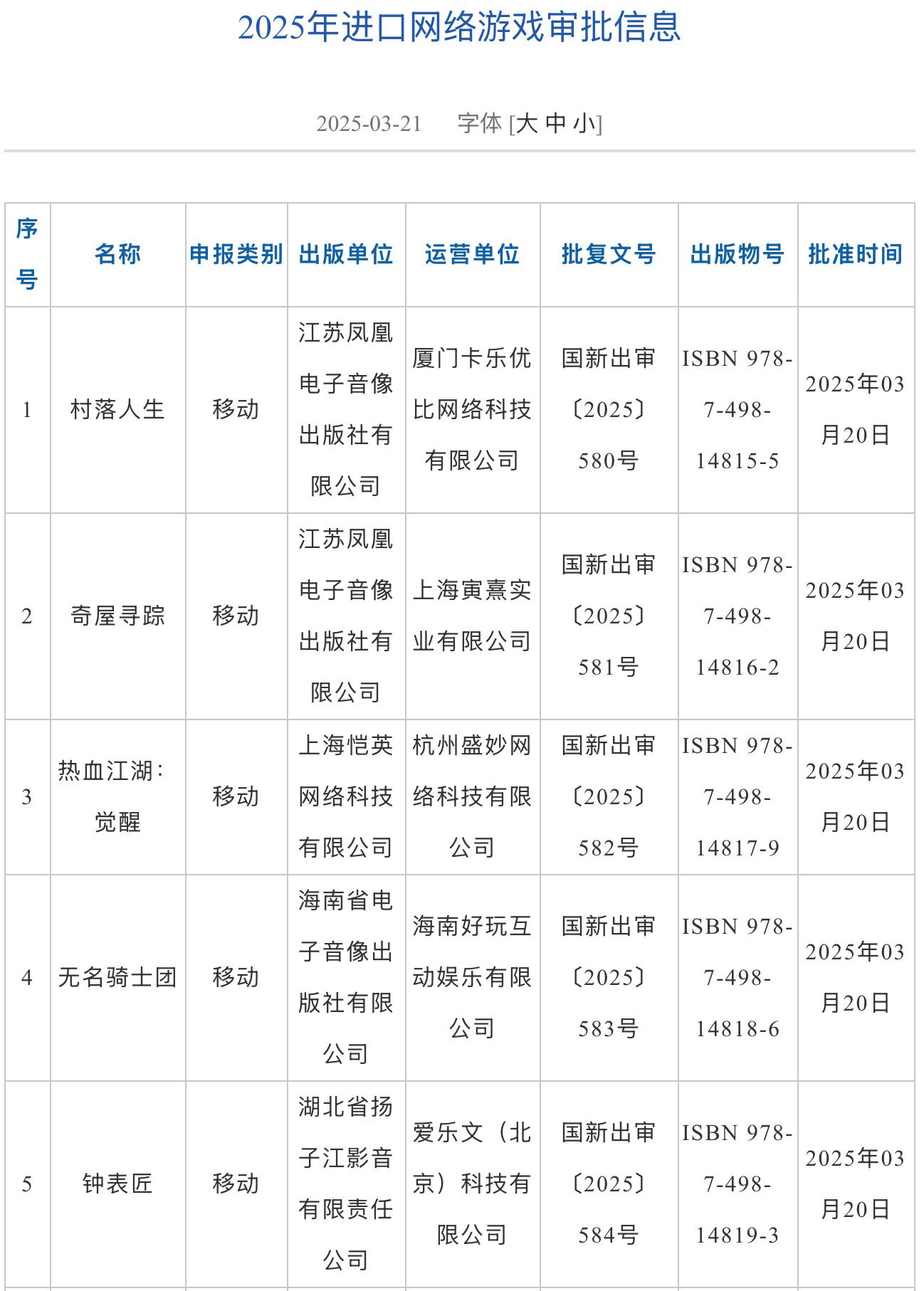 智通财经APP获悉,3月21日,国家新闻出版署发布2025年进口网络游戏审批信息,3月份共5款游戏获批,包括《村落人生》、《奇屋寻踪》、《热血江湖:觉醒》、《无名骑士团》、《钟表匠》。