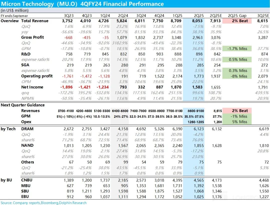 美光科技(MU.US)于北京时间2025年3月21日早的美股盘后发布了2025财年第二季度财报(截止2025年2月),要点如下: