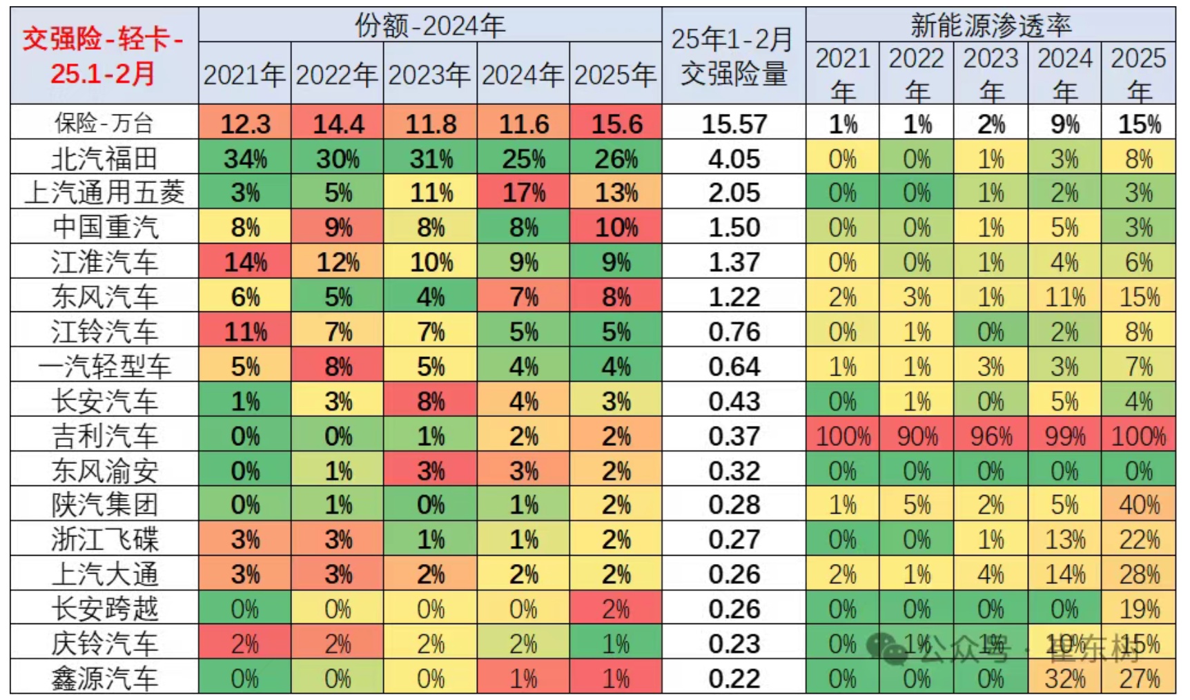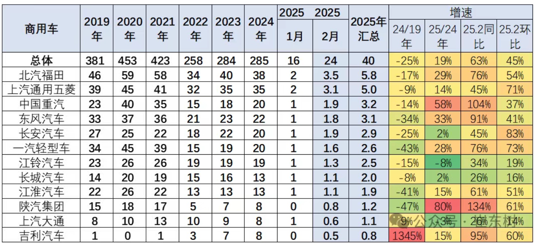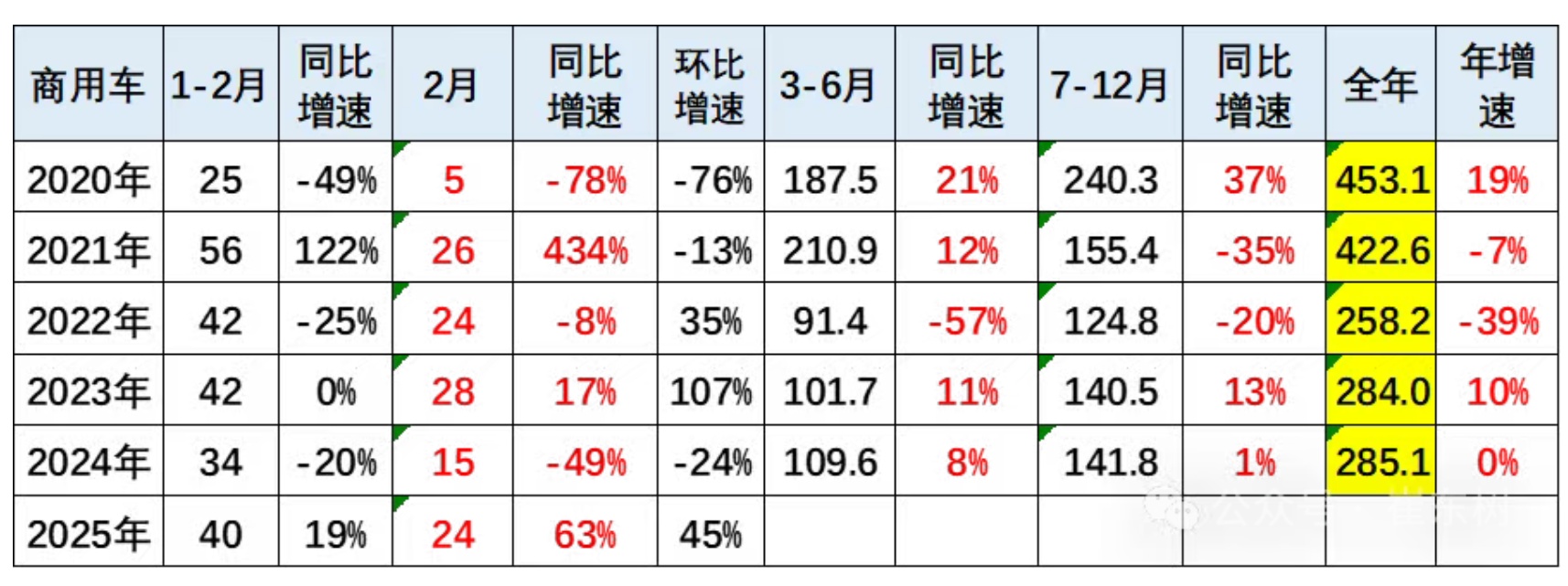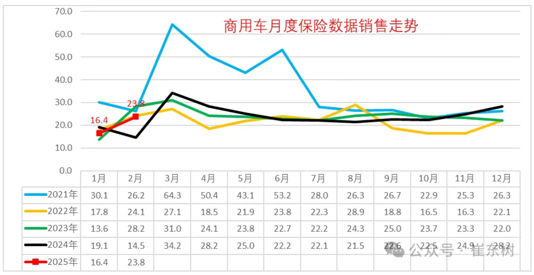 由于春节较早因素,对生产资料类产品有利,2025年2月商用车国内销量实现24万台,同比增长63%,环比2025年1月增45%。1-2月国内商用车保险数据40万台增19%。