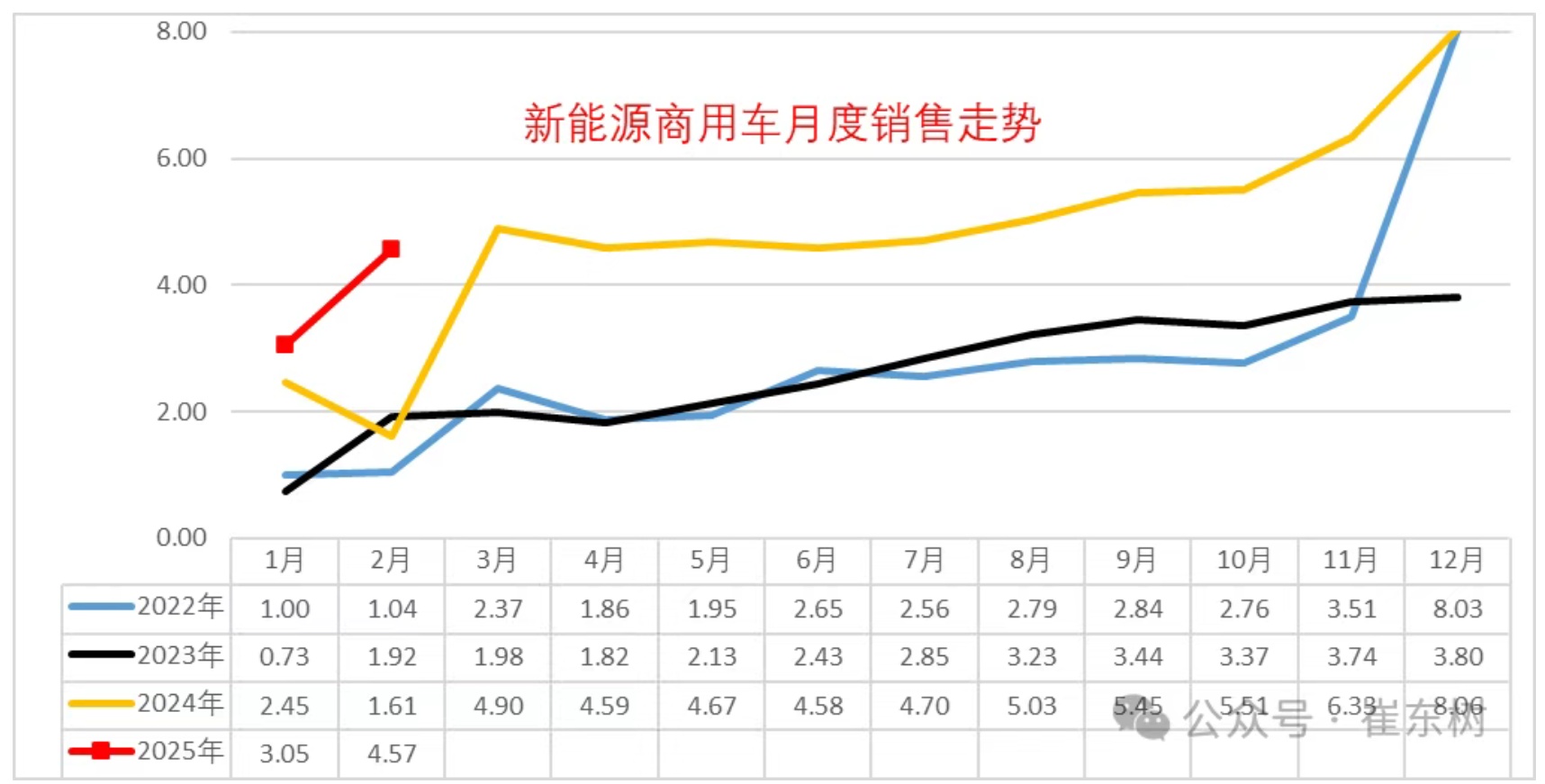 2025年新能源商用车整体呈现快速拉升的良好局面。由于2月的生产销售时间较同期长很多,因此2025年2月的新能源销量迅速回归到2024年的年初正常水平,说明新能源的需求旺盛。