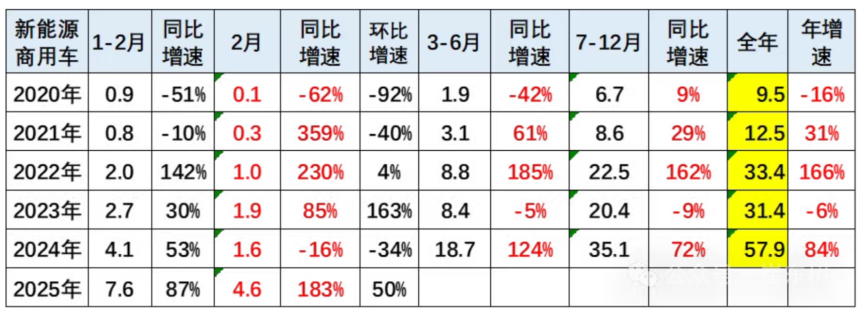 2024年份新能源商用车销量57.9万台,同比增长84%;2025年2月份达到4.6万台,同比增长183%,环比增50%,在2024年末政策翘尾后,2025年1月新能源表现相对较弱,2月暴增,1-2月累计达到7.6万,同比增长87%。