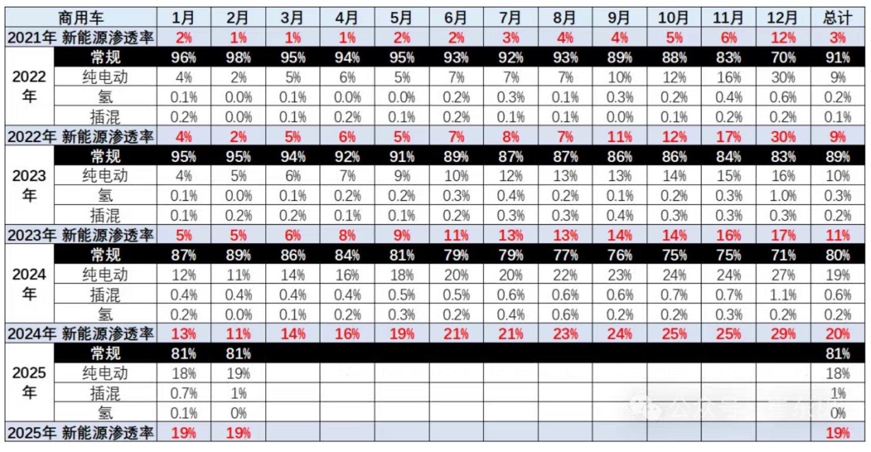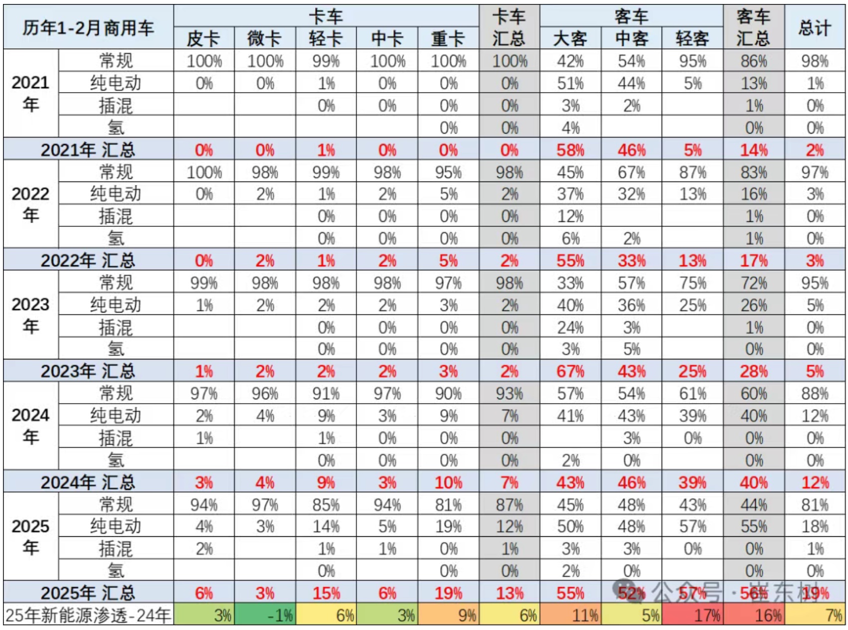 从2019-2021年,整个新能源商用车的渗透率在3%左右水平,2022年达到9%,2023年达到11%,2024年全年达到20%,2025年1-2月就达到19%渗透率的良好水平,体现了新能源商用车强势增长良好态势。