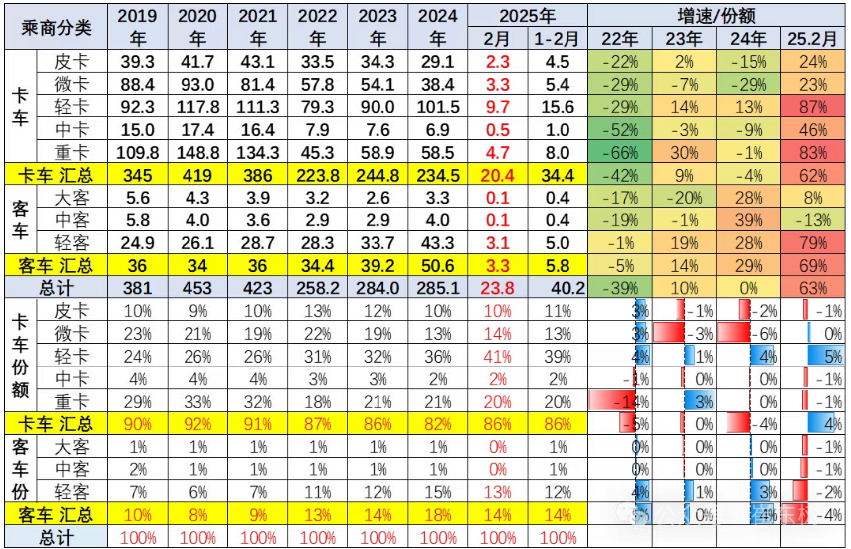 2025年商用车车市呈现2月强于1月的春节前置的走势特征,由于年末更新补贴的促进,2024年4季度销量较强,今年1月月度数据环比下降较大,2月商用车销量23.8万台,属于历年的销量中位。