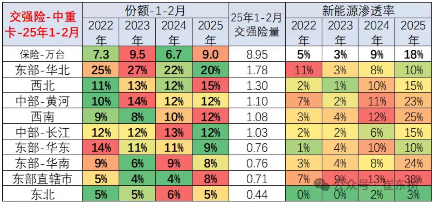 总体中重型卡车在华北、西北、西南、中部黄河地区市场份额较高,但今年1-2月的西北异常偏高。而新能源重卡在中部黄河、京津沪和西南地区等渗透率表现较好,其中中部黄河地区渗透率提升较快。
