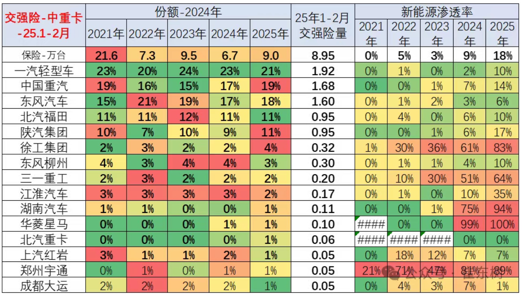 国内市场中重卡市场表现最为优秀的应该是东风汽车、一汽解放、中国重汽等企业,重卡总体表现相对平稳,徐工等部分重卡二线车企电动车渗透率提升。去年解放的12月冲刺力度很强,而且新能源较多,今年2月暂时较低。