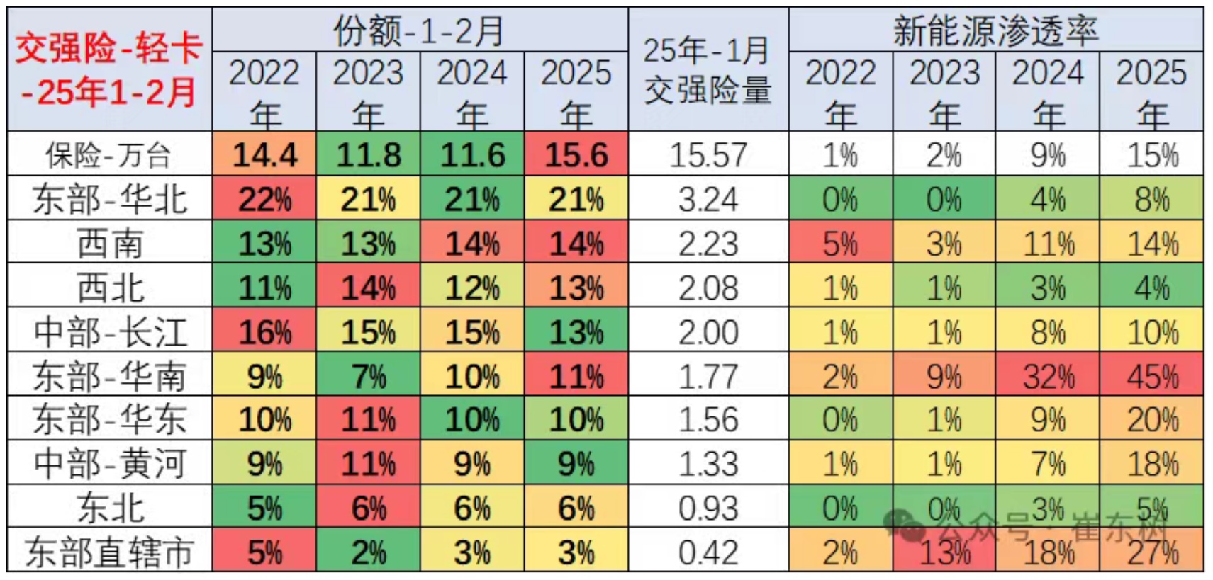 轻卡市场主要是在东部-华北和西南等地区份额较高,但西北地区的轻卡表现逐步走强。