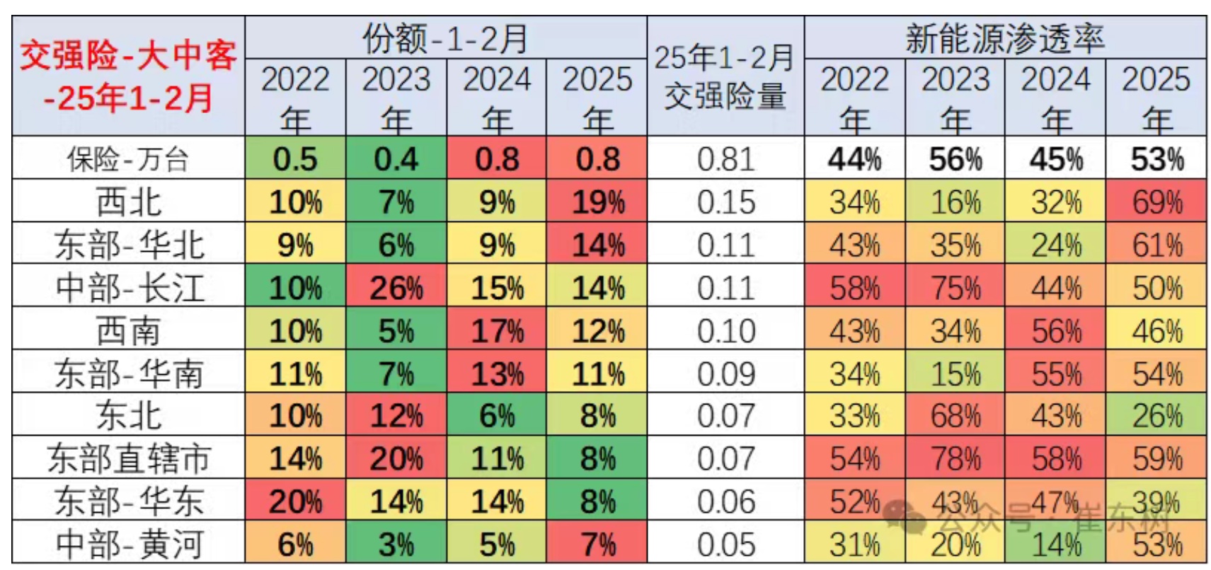 新能源大中客市场渗透率较高的主要是中部-长江、华南市场、京津沪等,其它地区看政策补贴,今年的西北和华北的公交启动较早。