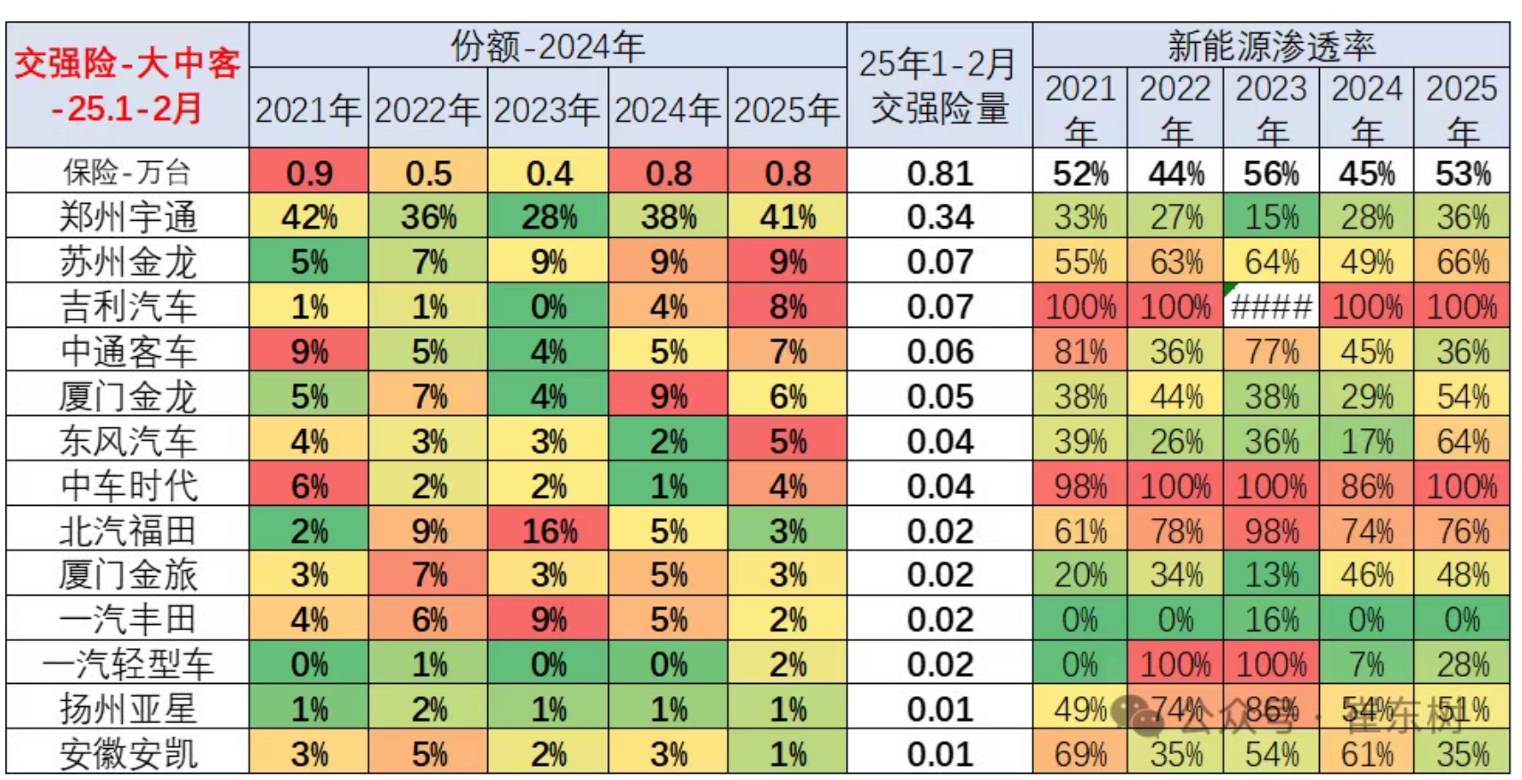 新能源大中客渗透率高的企业主要是二线企业,今年2月的中车时代的客车表现很好。主力企业都是燃油车的新能源全面发展的,且主力企业的燃油车市场不错。