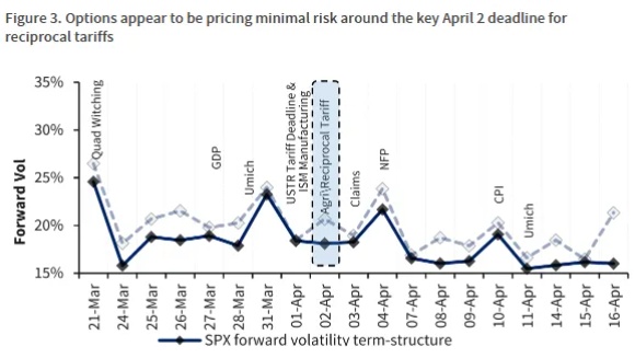智通财经APP获悉,尽管投资者正警惕地关注4月2日特朗普的关税生效日影响,但期权市场显示,这远不是接下来日历上唯一可能冲击市场的事件。标普500指数期权的隐含波动率显示未来两周内特定几天的波动将大幅上升,暗示届时市场对大幅波动的保护需求将增加。数据显示,3月31日和4月4日的波动将更显著——前者是是美联储青睐的通胀指标核心PCE价格指数公布之后的首个交易日,后者是美国月度非农就业数据公布日。