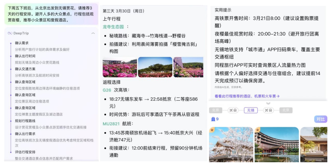 自宣布“程心AI”接入DeepSeek以来,同程旅行基于DeepSeek强大的分析推理能力,持续推进产品升级。“基于同程旅行超过20年的行业积累、文旅供应链资源和数据沉淀,我们致力于充分利用 AI 技术能力,将同程旅行丰富的宝藏产品,以更贴心、更自然、更省心的方式带给客户。”同程旅行副总裁余沛表示,升级后的“程心AI”,可以帮助用户更顺畅地完成从行程计划到产品预订的全流程,实现从“AI推荐”到“AI决策执行+预订执行”的闭环。