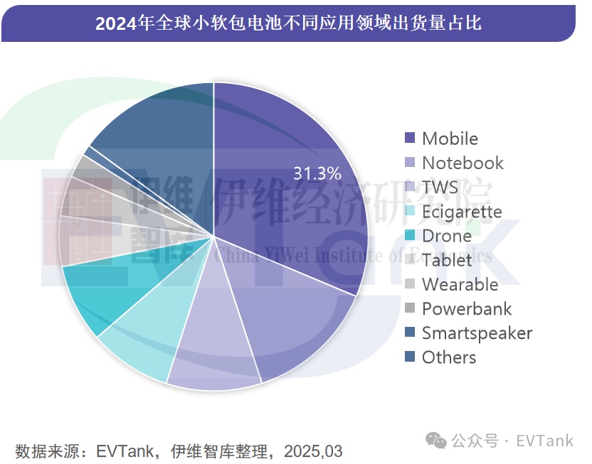 从应用领域来看,手机和笔记本电脑是小软包电池最大的应用场景。EVTank数据显示,2024年全球手机用小软包电池的出货量占比达到31.3%,笔记本电脑用小软包电池出货量占比为13.6%,其他领域包括无线耳机、电子烟、无人机、平板电脑、可穿戴设备、移动电源和智能音响等。