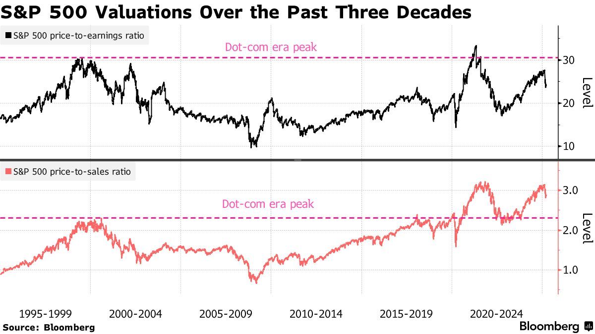 而那个时期的回声似乎再次响起。本轮科技热潮的核心是人工智能(AI)。经历了疯狂的股市上涨之后,标普500指数从2022年10月的低点飙升72%,至上月达到峰值,总市值增加了超过22万亿美元。然而,危险的信号开始显现。股市正在下跌,纳斯达克100指数已下跌超过10%,进入修正区间;标普500指数也一度接近这一水平。这种对称性让人不禁想起25年前的互联网泡沫破裂。